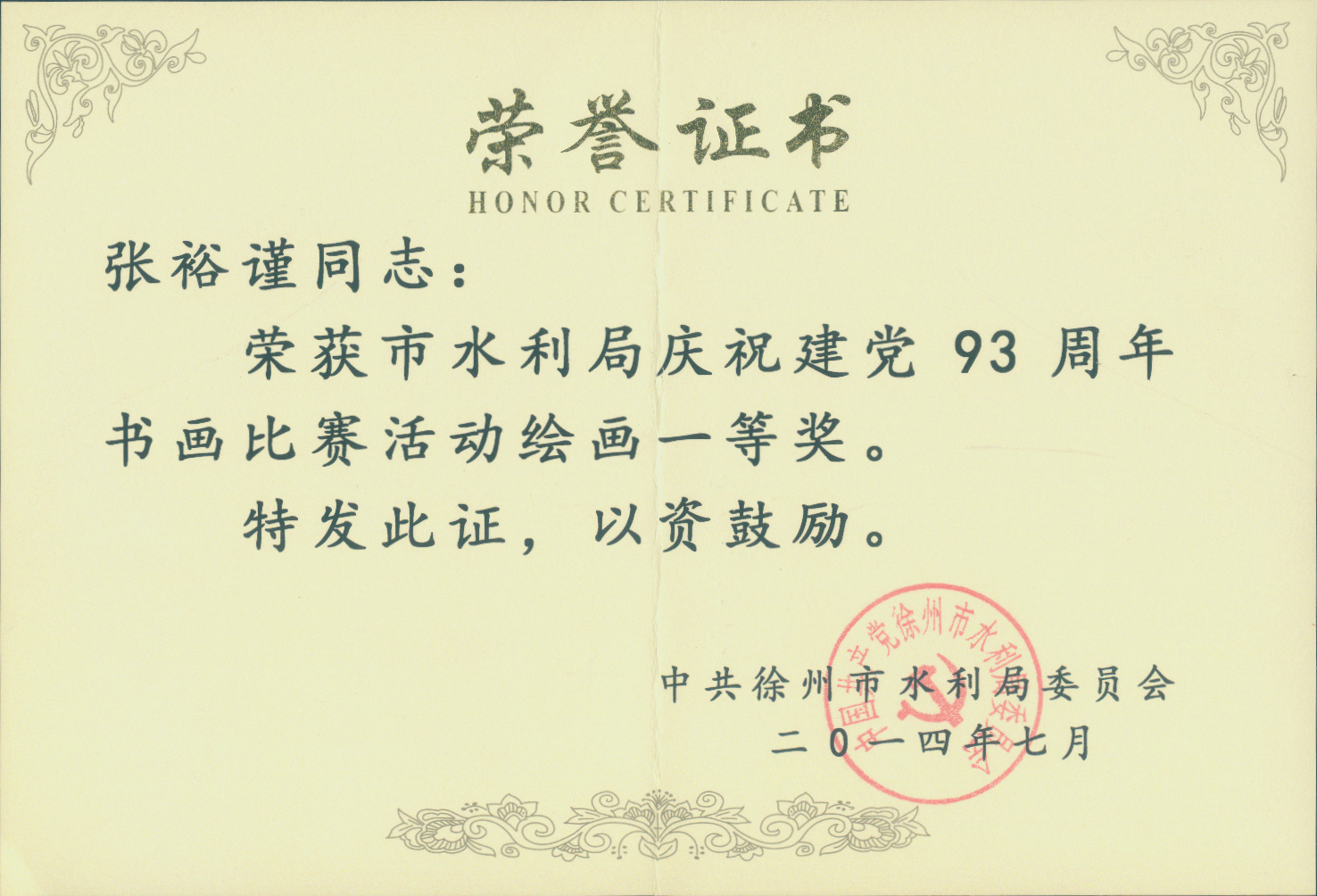近日,市水利局舉辦慶祝建黨93周年書畫比賽活動。本次書畫比賽以“學(xué)黨史、知黨情、跟黨走”為宗旨,以“濃墨書華誕,丹青繪七一”為主題,緊密圍繞建黨93周年,緊扣時代主旋律,踐行黨的群眾路線,以書畫形式思黨恩、頌黨情、贊黨績,謳歌黨的豐功偉績,加強(qiáng)了水利局書畫愛好者之間的交流溝通。本次書畫比賽共收到到毛筆書法、硬筆書法、國畫、工筆畫等作品30余幅并進(jìn)行集中展出,參賽作品主題鮮明,內(nèi)容豐富,充分反映了水利系統(tǒng)干部職工熱愛黨、熱愛祖國、熱愛社會主義,創(chuàng)先爭優(yōu)的良好精神風(fēng)貌。經(jīng)組委會最終評定,我院職工張裕謹(jǐn)最終獲得軟筆書法、繪畫一等獎。